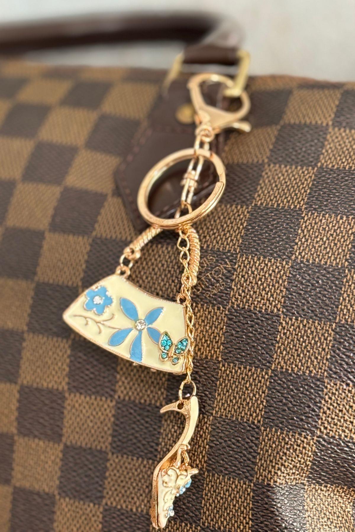 Bu şık metal anahtarlık ve çanta süsü, göz alıcı detayları ile öne çıkıyor. Üzerinde yer alan parlak boncuklar ve sedefli mine boyası, tasarıma zarif bir dokunuş katıyor. Hem anahtarlık hem de çanta aksesuarı olarak kullanılabilen bu ürün, stilinizi tamamlamak için mükemmel bir seçimdir. Zarif tasarımı ve çok yönlü kullanımı ile bu ürün, tarzınıza sofistike bir hava katacaktır.