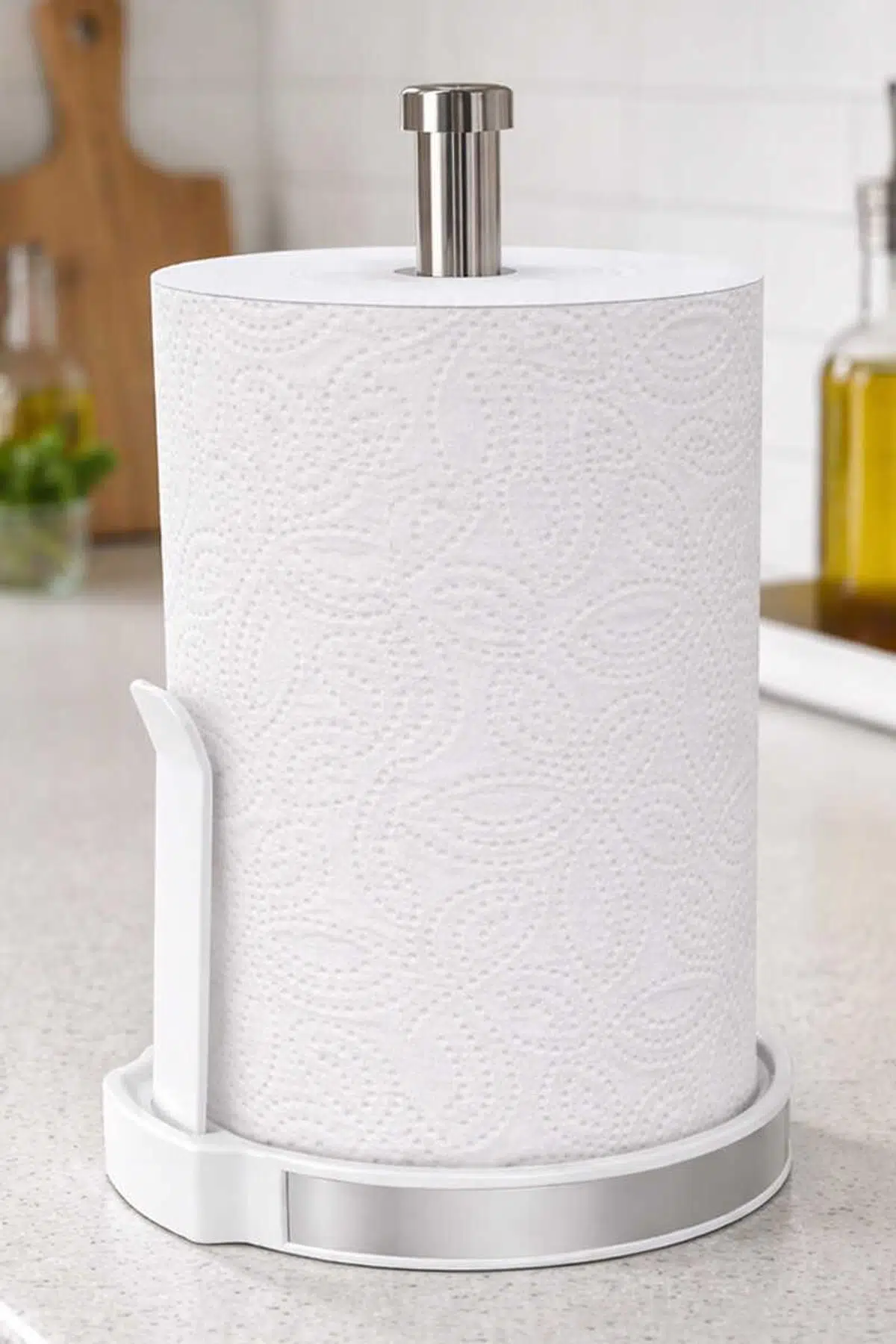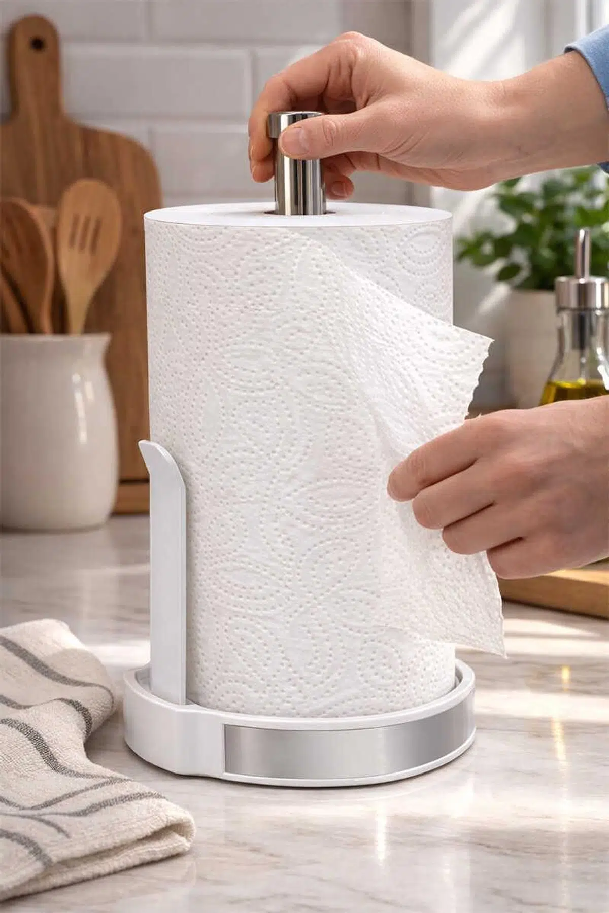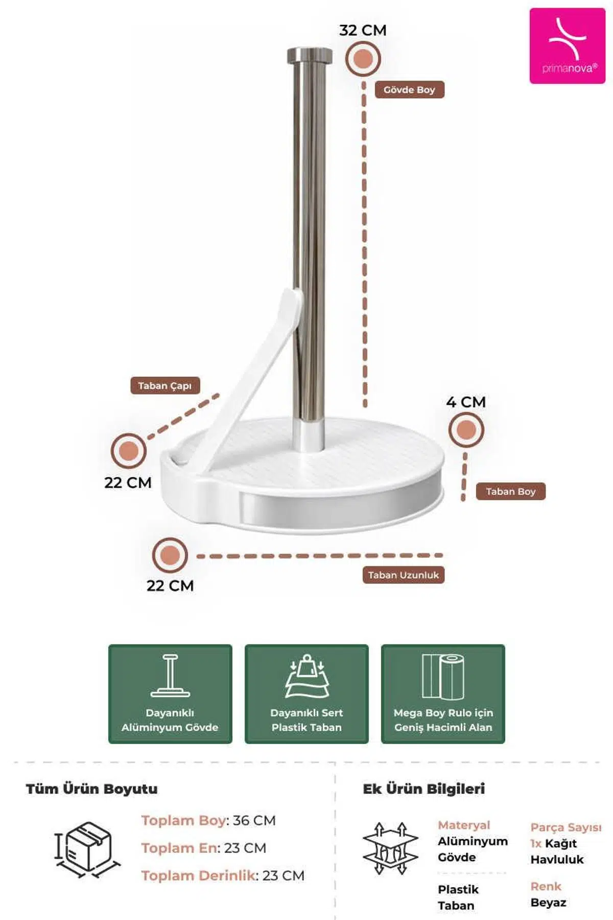Mega Kağıt Havluluk - Beyaz Geniş tabanı sayesinde kağıt havlularınızı kullanırken sabit kalır, kaymaz. Dayanıklı alüminyum gövdesi uzun ömürlü kullanım sunarken, sert plastik tabanı ekstra denge sağlar. Mega boy rulolar için geniş hacimli alanı sayesinde büyük kağıt havlularla uyumludur. Modern tasarımı ve sağlam yapısıyla mutfak ve tezgah üstlerinde düzen sağlar. Beyaz rengin şık ve zamansız görünümü mutfak dekorasyonunuza modern bir dokunuş katar. Ürün Bilgileri Malzeme: Alüminyum Gövde, Sert Plastik Taban Renk: Beyaz Parça Sayısı: 1x Kağıt Havluluk Boyutlar: Toplam Boy: 36 cm Toplam En: 23 cm Toplam Derinlik: 23 cm Gövde Boyu: 32 cm Taban Çapı: 22 cm Taban Yüksekliği: 4 cm