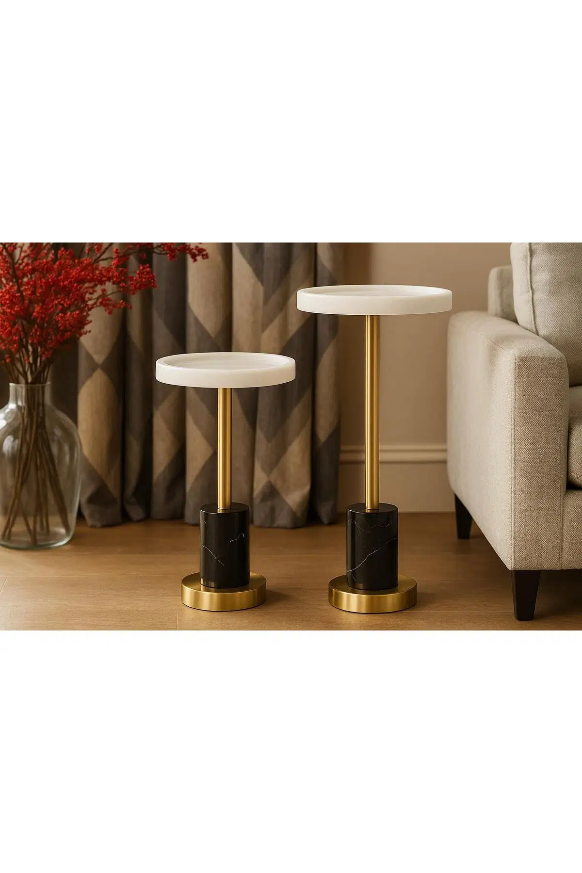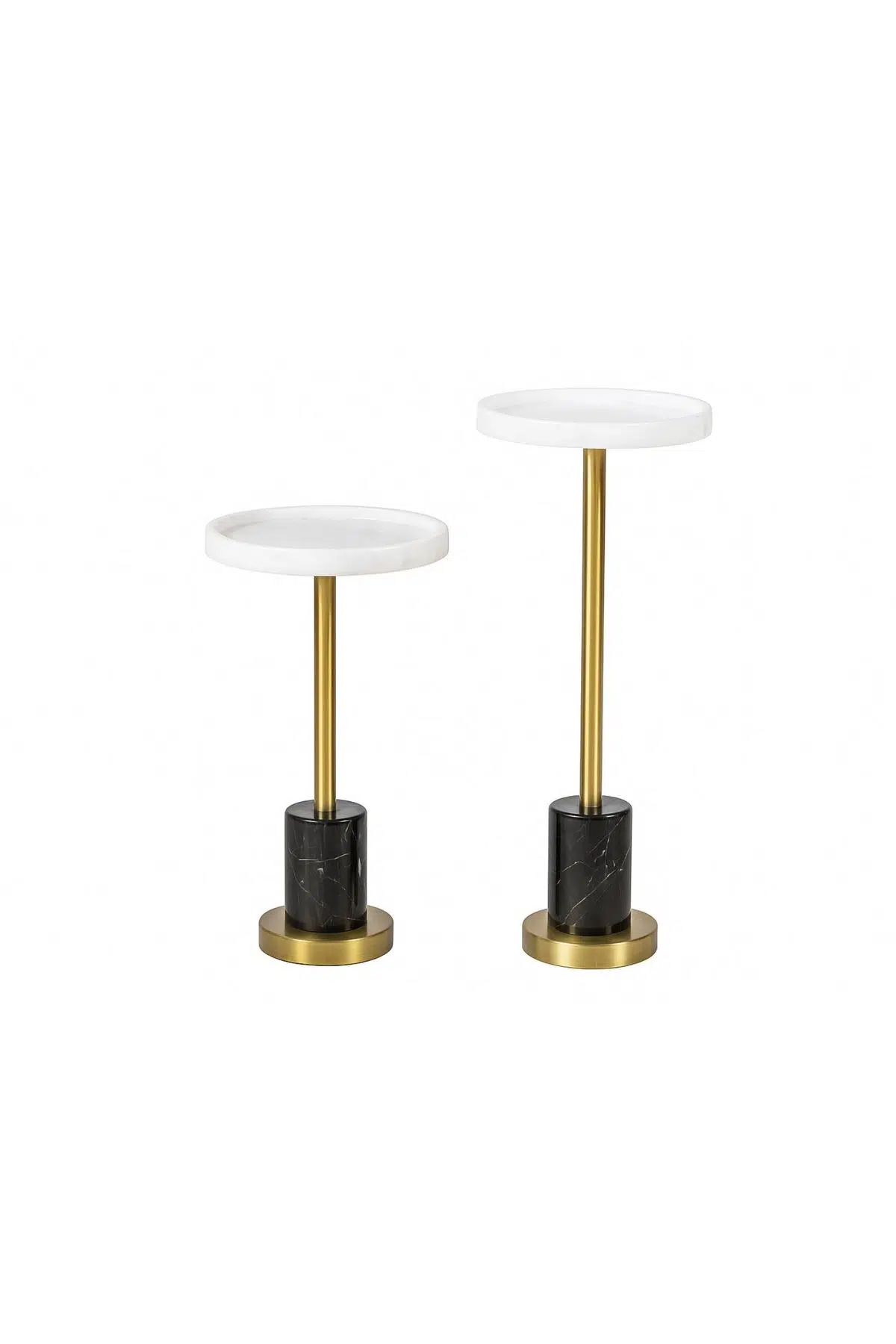 Beyaz mermer tabla, siyah mermer ayak ve pirinç tonlu metal detaylardan oluşan modern 2’li sehpa seti. Şık, fonksiyonel ve her yaşam alanına uyumlu bir tasarım.