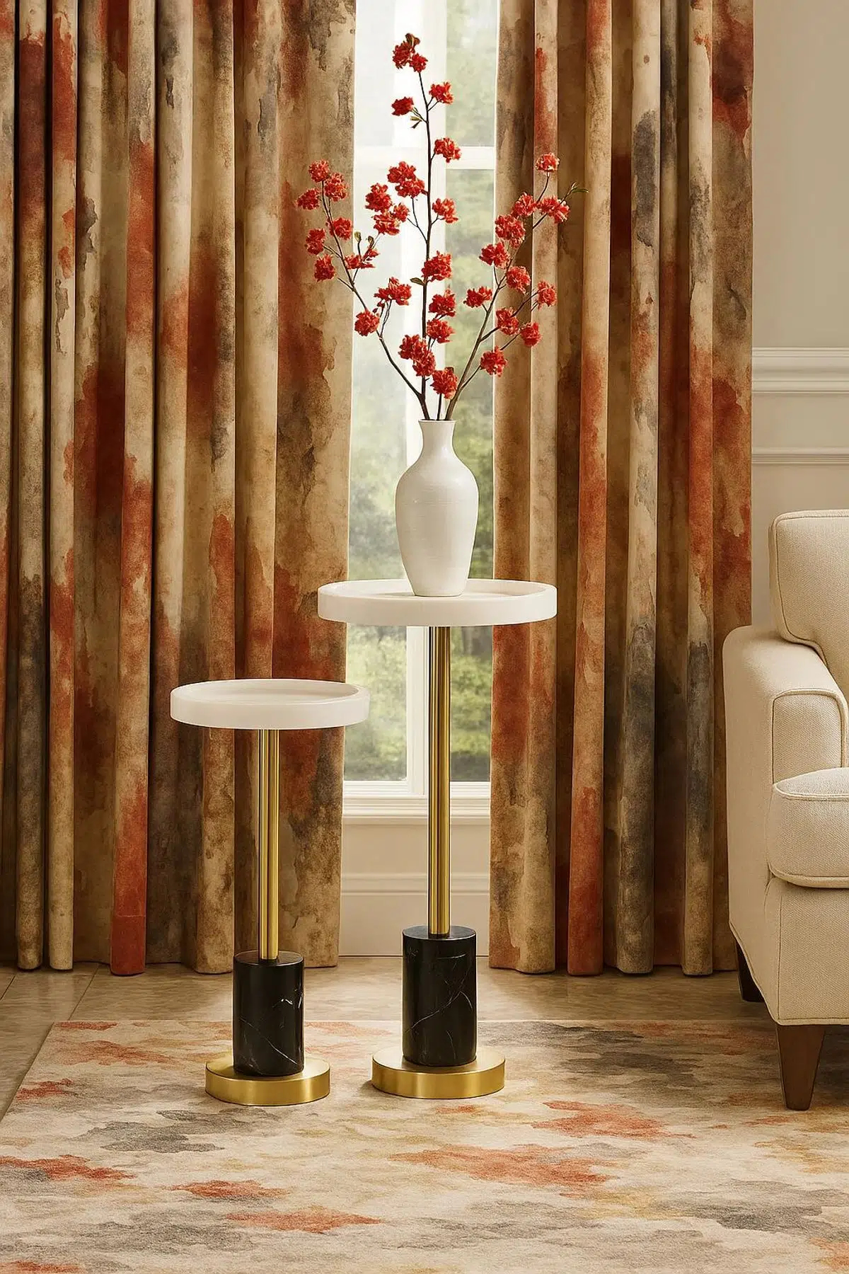 Evza Bitter 2’li Sehpa Seti, modern zarafeti doğal malzeme dokusuyla birleştirerek zamansız bir görünüm sunar. Üst tablası parlak beyaz mermer, alt kısmı ise siyah mermer ve pirinç tonlu metal detaylarla desteklenmiştir. Yüksekliği 70 cm ve 63 cm olan iki ayrı sehpa, birlikte veya ayrı ayrı kullanılabilir. Minimal formu sayesinde salonlarda, oturma köşelerinde ya da yatak odalarında kahve, kitap veya dekoratif objeler için mükemmel bir tamamlayıcıdır. Estetik görünümünün yanı sıra sağlamlığıyla da uzun yıllar kullanılabilecek niteliktedir. Evza Bitter serisi, sade ama etkileyici çizgileriyle her mekâna modern bir dokunuş kazandırır.