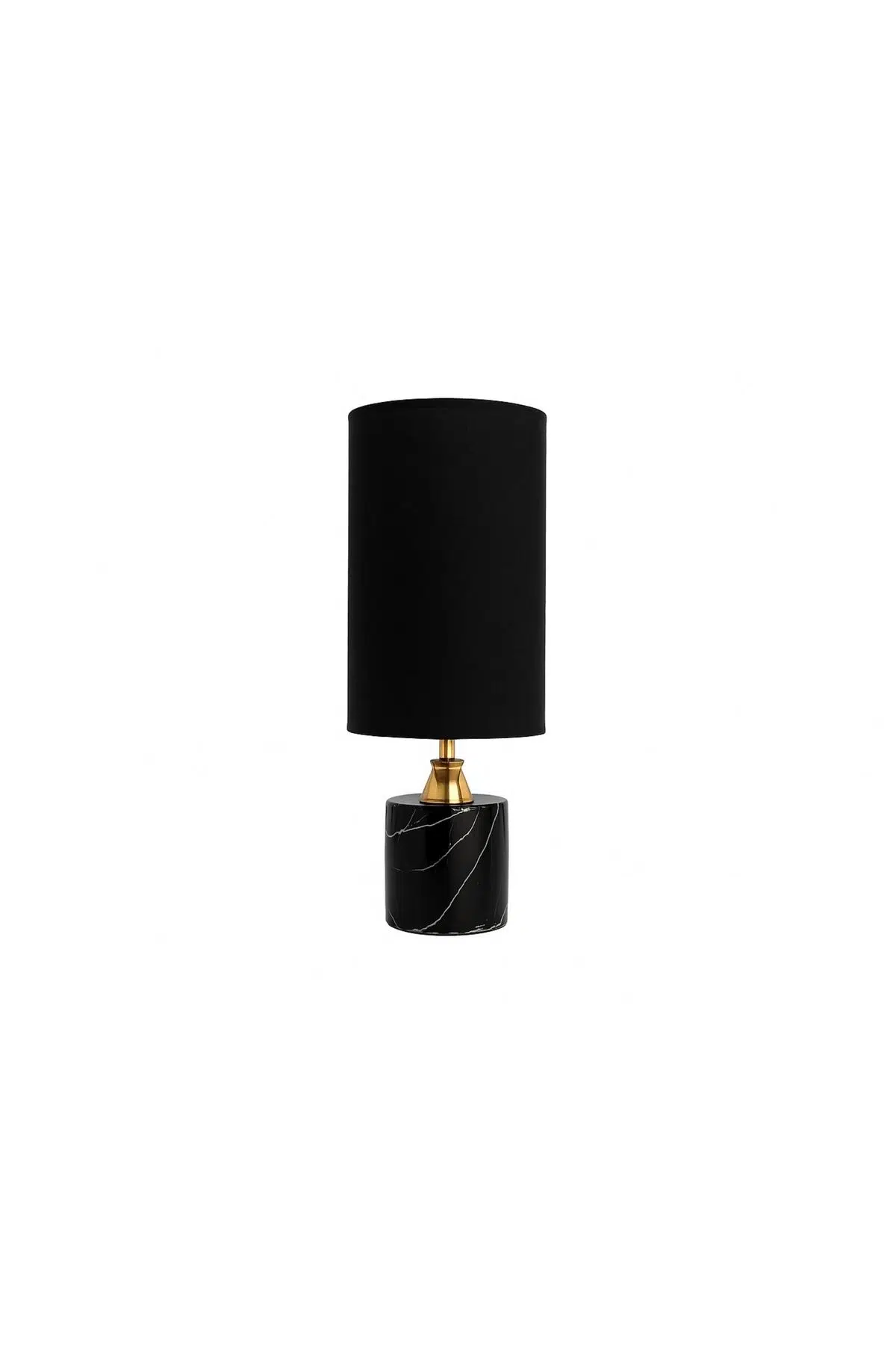 Siyah mermer kaide ve siyah kumaş abajur şapkasıyla modern, sade ve zarif bir masa abajuru.