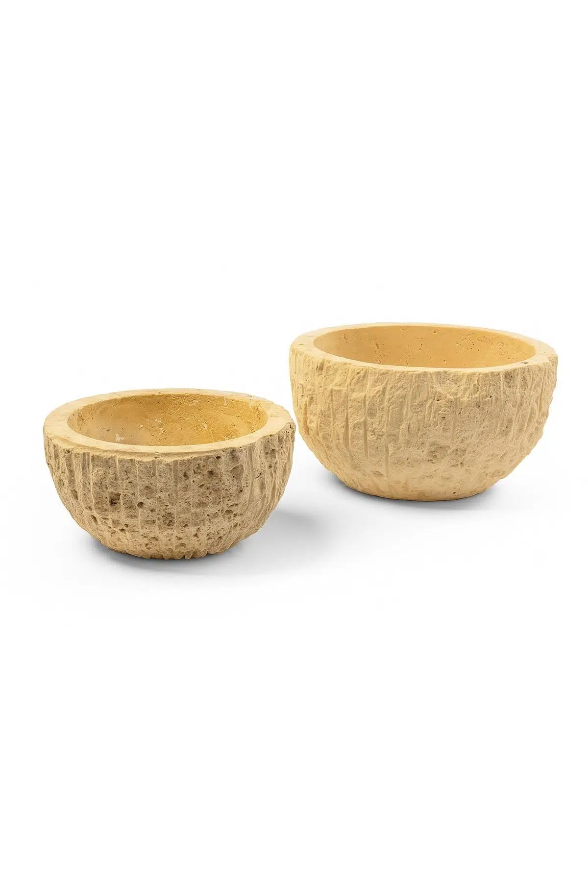 Doğal taş dokusuyla tamamen el işçiliğiyle üretilmiş iki parçalı traverten kase seti. Her ürün benzersizdir, yüzey farklılıkları doğal taşın karakterini yansıtır.
