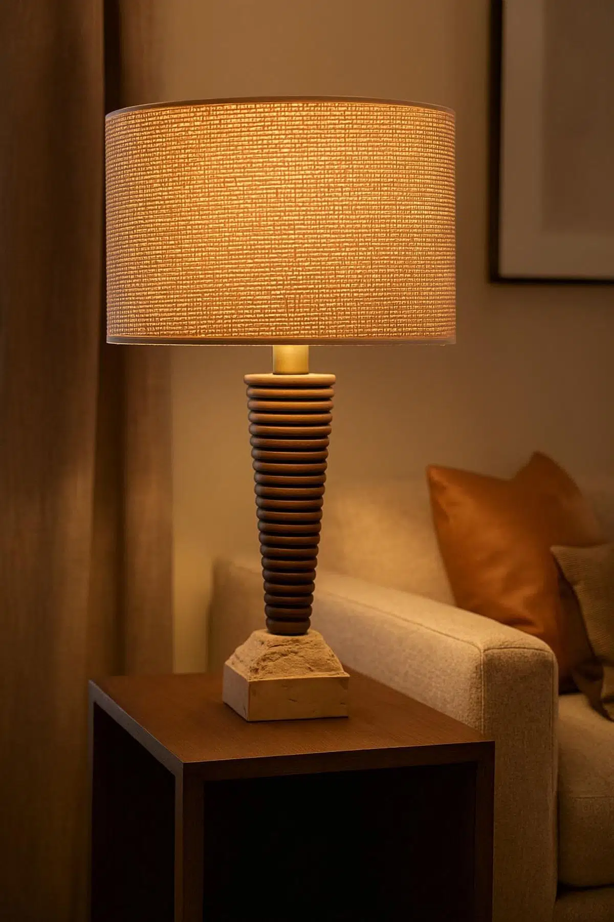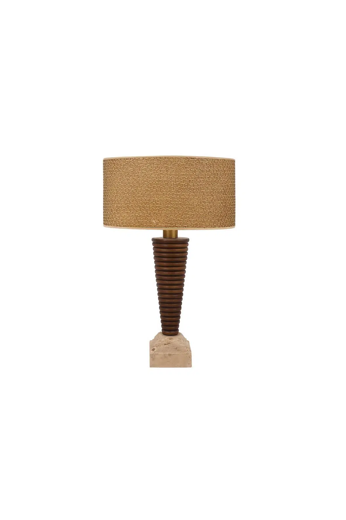Hasır abajur şapkası, ceviz renkli ahşap gövdesi ve doğal traverten taş ayak detayıyla yaşam alanlarına sıcak ve zarif bir dokunuş katan masa abajuru.