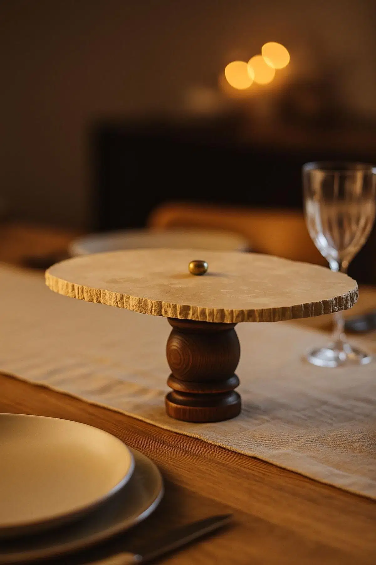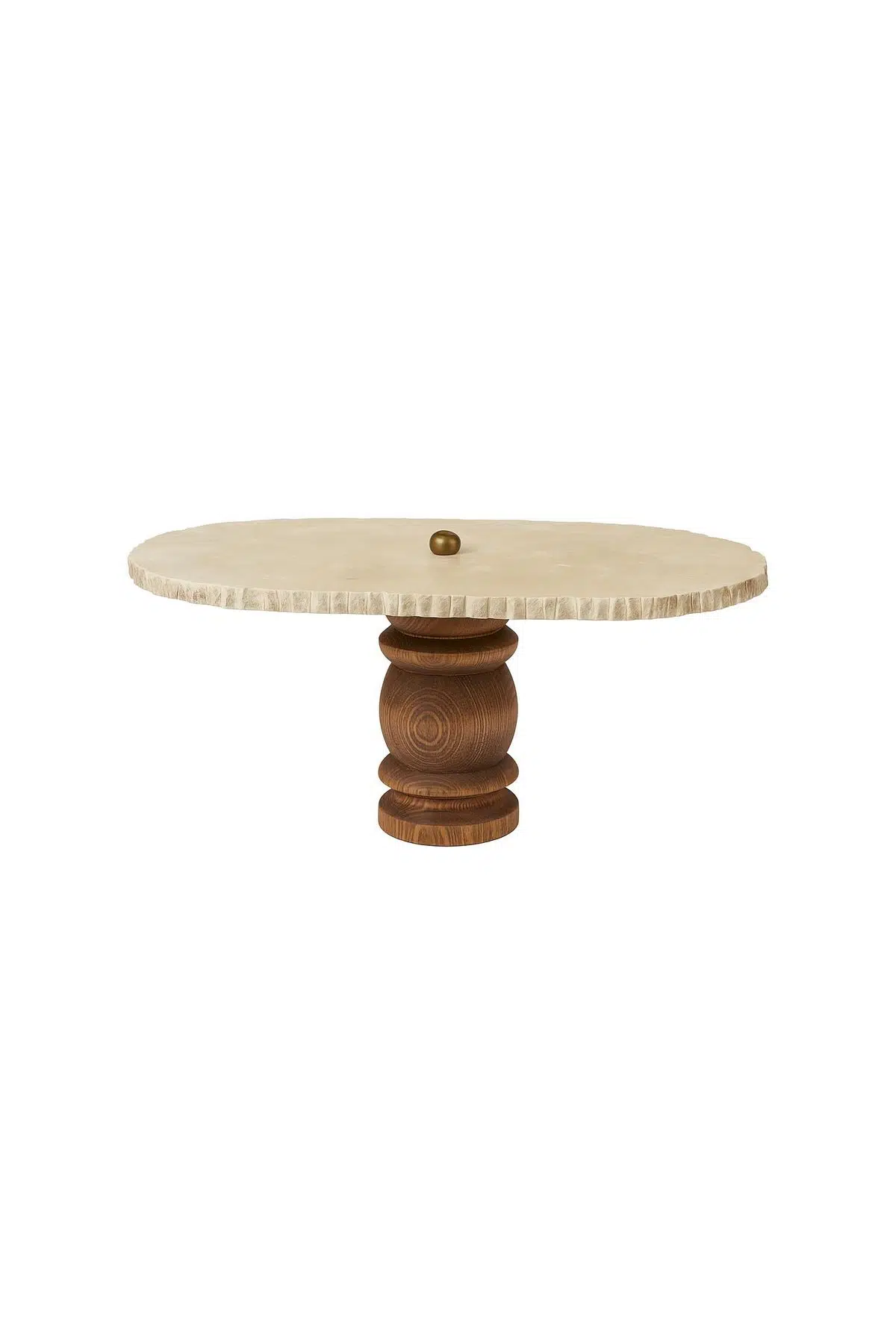 Doğal kenar dokulu traverten yüzey, ceviz tonlu ahşap kaide ve metal detayla tasarlanmış, sofralarda alanı verimli kullandıran yüksek oval sunum tabağı.