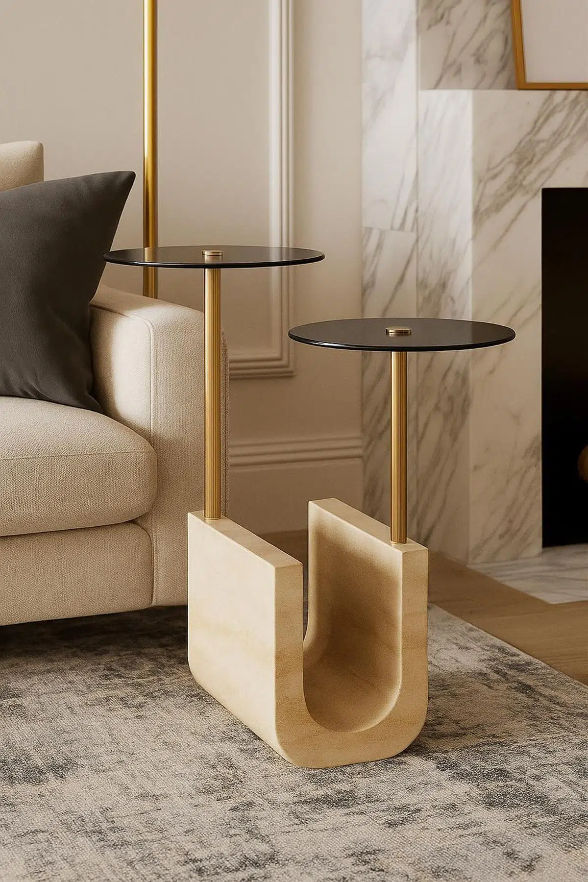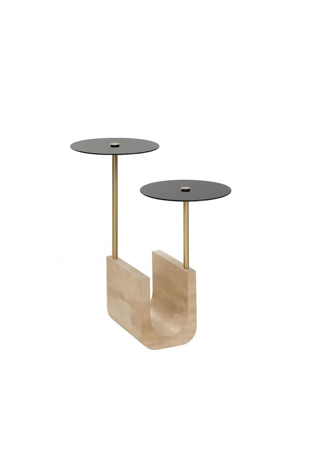 Alt kısmı masif traverten bloktan oluşan, 40 cm çapında iki cam tablaya sahip modern ve fonksiyonel gazetelik sehpa.